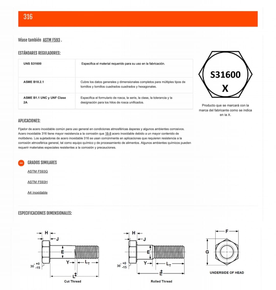Tornillo hexagonal Inoxidable T316, en largos y diámetros varios.