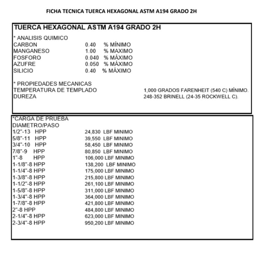 Tuerca hexagonal ASTM A194, en diámetros varios.