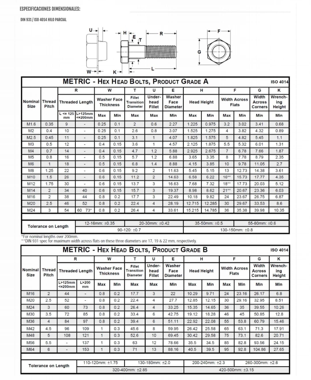 Tornillo hexagonal Métrico, Métrico fino, métrico extrafino, en largos y diámetros varios.